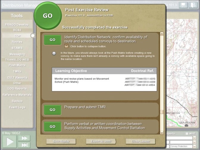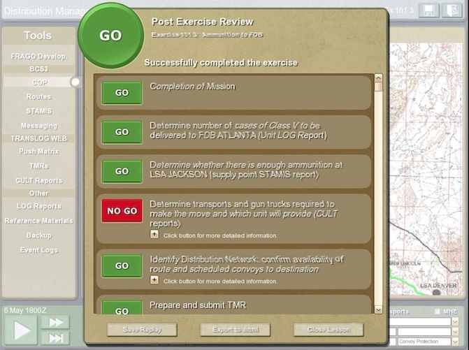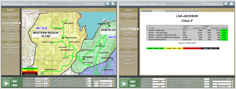 The goal here was to train logistics specialists. An army needs supplies in order to fight, and logistics personnel see to it that they have what they need when they need it. It’s a critical and complicated job, but not always immediately rewarding. It involves reading reports, finding available transports, monitoring road safety and closures, and dealing with sudden changes in requirements. The Army developed standardized planning and reporting software, so we had to replicate its key functions in our app.