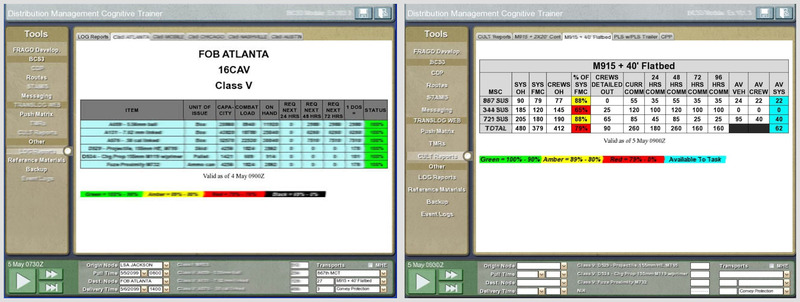 Similarly, we had to decide how much of a simulation would be required in order to make our lesson plans work. We decided that, since the typical logistics cycle is 72 hours, we would need to replicate events during that time, and therefore needed at least a semblance of real-time tracking for each vehicle. This was made even more necessary by the possibility of random events causing changes in plans.