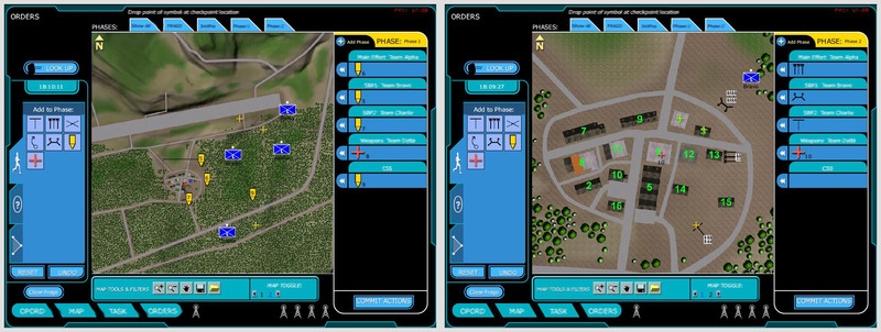 In the Army, a Company is made up of a headquarters section, several platoons, and sometimes other specialized units. In Full Spectrum Command, we enabled the company commander to specify orders for multiple platoons or other units, which would then be carried out via AI. The company commander is not typically “out front,” but instead is in a central location monitoring events and giving orders, as needed. Our user interface design reflected this primarily high-level view of the battlefield.