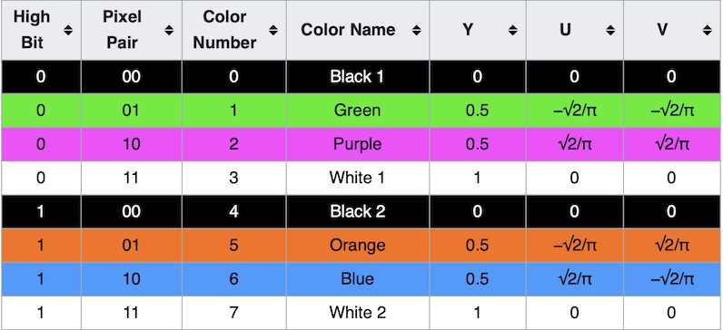 The Apple ][ won the prize for the weirdest graphics mode. Their “HIRES” mode had eight colors, but two of those were different versions of black and white, so in reality there were six colors: black, white, orange, green, purple and blue. And sometimes colors of one type were not allowed to be next to colors of a different type. As Wikipedia points out, this was weird even by the standards of the 1980s; it was a side effect of designer Steve Wozniak’s efforts to minimize chip count in the machine (chart courtesy of Wikipedia).