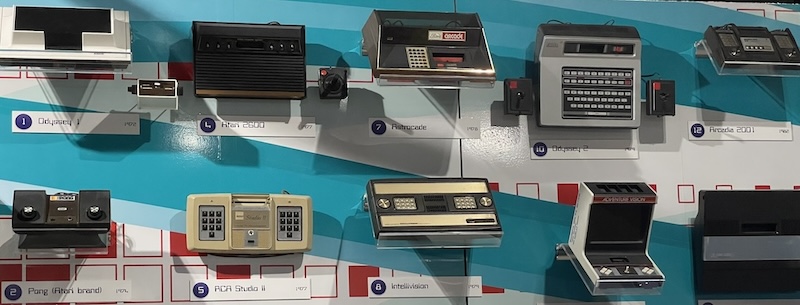 That was the beginning of the era of programmable video game consoles. The Intellivision, seen here at bottom center in this photo from the National Video Game Museum, was the first 16-bit console, sporting a powerful (for its day) 880 kHz General Instrument CP1610 CPU and a custom graphics chip that could display eight simultaneous moving objects and play sounds on three independent channels.