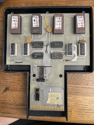 For Space Spartans, the game tried to be a full 3D galaxy navigation and combat game. We still have copies of the original EPROMs that were burned just before we took over the project. This rare photo shows the interior of a "T-Card" used for development, with the four EPROMs containing the 8K of game code (Intellivision games used an unusual 10 bit wide format, so two EPROMs were needed for each 4K bank).