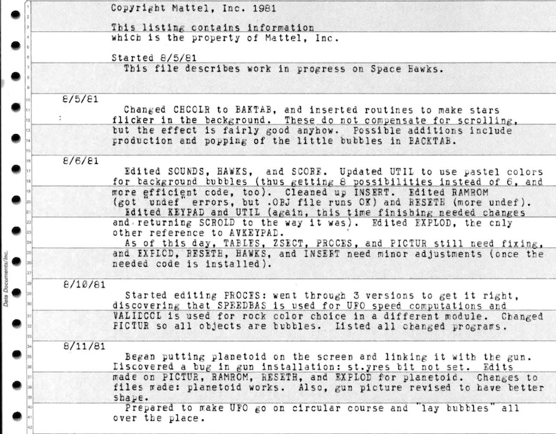 The source code listing for Space Hawk still exists. It’s now archived at the National Video Game Museum. Not only is it one of the few existing examples of early video game code, but it also contains at the end of the listing a complete day-by-day diary of what was done on the game during development, beginning in August of 1981. This is a short excerpt of the printed paper listing (the full document is a 1”-thick book, printed on 11x14” line-printer paper – a true relic of that era).